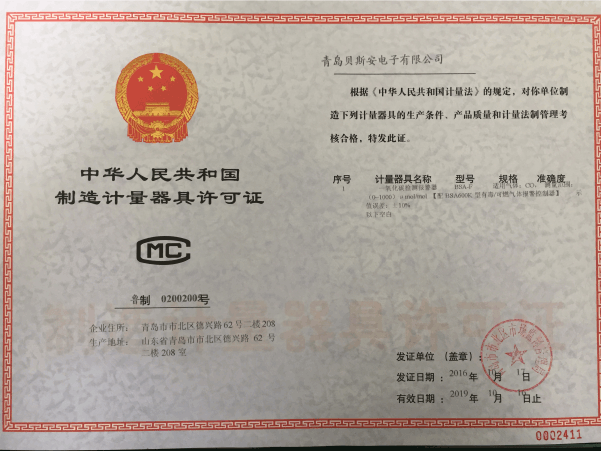 我公司是青島市具有國家質量技術監督部門頒發的計量器具生產許可證的生產企業;獲得國家防爆電氣產品質量監督檢驗中心頒發的防爆合格證;獲得國家公安部消防產品合格評定中心頒發的消防產品形式認可證書。